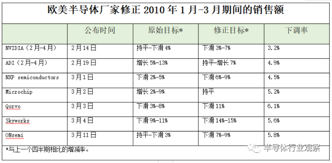 新冠肺炎首先袭击了劳动密集型的EMS(Electronic Manufacturing Services,即电子制造服务)行业。春节以后,制造人员的复工率一直较低,即使到了3月底整体的复工率也=达到了7-8成左右。此外,再加上物流运输的放缓、零部件调配的延迟,导致2月-3月的智能手机生产量远远低于往年。主要生产据点位于中国大陆的台湾大型EMS厂家鸿海2020年1月-2月的销售额去年同比减少14%,Pegatron(和硕联合科技)去年同比减少13%,双方都出现了两位=的负增长。全球汽车的的主要供应链也大部分布置在中国大陆,整车与智能手机一样,生产几乎陷入停滞。由于新冠肺炎的影响,人们几乎没有任何购买新车的欲望,与其说是;厂的停工导致了供给方面的不足,不如说是消费的“冷清”导致了生产的萎缩。以欧美为中心的海外半导体厂家也受到新冠肺炎的影响,相继下调2020年1月-3月期间的财政目标值,但是,修改财政目标也仅仅是基于当下可以预测到的影响,4月-6月以后的业绩预测值还存在进一步下跌的风险。各家欧美半导体厂家2020年1月-3月的销售额预测。(表格出自:sangyo-times)日本企业一般是公布整个财政年度的业绩目标,而大多数欧美企业多是公布每个四半期的业绩值,进入3月以来越来越多的欧美企业开始修正已经公布的四半期的预测值。亚德诺半导体(Analog Devices)和英伟达(NVIDIA)在2月中旬公布的2月-4月的业绩预测值是考虑新冠肺炎的影响后的数值。下滑率如果是3%-6%的话,实际受影响的金额约为5,000万-1亿美元(约人民币3.5亿-7亿元)。下调业绩预测值的企业中,Qorvo、Skyworks、Analog Devices的主力产品之一就u通信相关的元件,因此受到智能手机、通信基础设施供应链的影响较大。另一方面,NXP、ONsemi受到的影响主要来自于汽车和工业设备。此外,博通等公司甚至撤销了原来公布的2020年财年的整期财务预测值。目前,虽然日系半导体厂家还没有对业绩预测值进行调整,但是据预测,与以上这些海外厂家进行竞争的瑞萨电子(Renesas Electronics)、罗姆(ROHM)等企业其实也受到了几乎同等程度的影响。但是,当前在智能手机领域,不少半导体的客户开始出现增加库存的行动,各家半导体供应商也对客户的异于宏观环境的行动感到不解。中国的华为等公司在2019年末时间点,在原有库存(约4-6个月)的基础上试图再增加库存。尽管其目的不为外界所知,但有观点认为是为了规避中美贸易摩擦的影响,而备足安全的库存,此外,也有业界相关人士指出:“由于情况尚不明确,因此我们暂时不能降低订单数量”。因此,也有人指出,各家公司的1月-3月期间及4月-6月期间的业绩受到较高库存的影响,账w上的数字看起来并不是那么难看。但是,6月份以后,如果实际需求没有得到恢复,实际需求与库存水平的鸿沟可能会越来越大,下半年及后续业绩下滑的风险可能会更高。