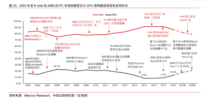 近两年来,有一些追赶者包括AMD、联发科、三星等厂商似乎迎来了新的发展机遇,从其所公布的业绩报告中便可反映出这一点。从他们的飞速成长到挑战龙头,这些“后浪”的举动,是否会搅动当前半导体市场的格局?自去年以来,很多芯片厂商都得到了飞速的发展,甚至还有一些芯片厂m已经开始抢夺原本被行业龙头长期占据的市场。AMD无疑是去年当中最为闪亮的一颗明星,其于2019年推出的7nm Zen2架构的三代锐龙、EPYC 7002系列处理器,以及基于7nm的5700/5500系列显卡将AMD推向了近五十年来的高光时刻——据Mercury Research数据显示,2019年AMD在整个消费级X86市场上抢占了英特尔3.2%p全球份额,在服务器市场也夺得了1.4%。从成长速度上看,2019年AMD在消费级X86市场和企业级服务器市场分别同比增长32.4%、63.5%,这也远远高于英特尔的成长速度。