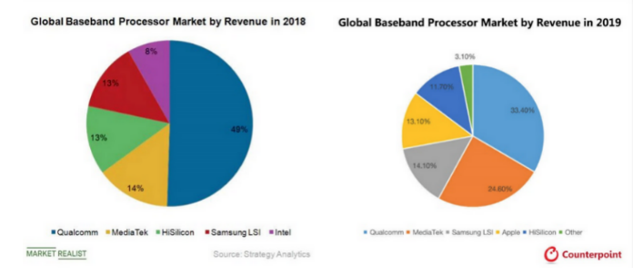(英特尔和AMD市场份额变化以及新产品节点,来源:中信证券)能够取得这样的成绩,就连AMD总裁兼首席执行官苏姿丰博士也曾在去年的财报会议中表示,2019年对于AMD的发展历程来说,具有里程碑意义。她表示:“在这一年中,AMD成功得推出了50年历史上最强大的产品组合。凭借锐龙和EPYC(霄龙)处理器增加了市场份额,从而获得了利润的显著增长及利润率的极大提升。”同样的故事在手机芯片市场中再次重演。在去年当中,联发科不仅推出了5G 基带芯片Helio M70,还于年底推出了基于7nm工艺和A77+G77架构的5G处理器天玑1000,以及面向中低端的5G SoC天玑800。通过在4G和5G手机芯片上的全面布局,联发科在去年当中的表现也令人惊艳——据Counterpoint的2019年全球手机芯片市占率报告显示,联发科在2019年以24.6%的市场占有率位居第二,仅次于高通,相较于2018年提升了10.6%,而高通却在当年下滑了15.6%。