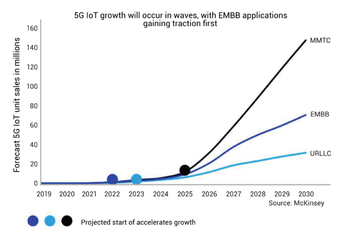 5G,就是第五代移动通信技术,拥有光纤般的接入速率,“零”时延的使用体验,千f设备的连接能力,超高流量密度、超高连接数密度和超高移动性等,超百倍的能效提升和超百倍的比特成本降低,相比于4G,5G实现从质变到量变的飞跃,开启万物广泛互联、人机深度交互的新时代,成为新一轮科技革命和产业变革的驱动力。5G通讯向下兼容4G\3G\2G。5G 拥有丰富的应用和趋势。其中,最具潜力的趋势有三个:增强型移动宽带 (eMBB)、 超可靠低延迟通信 (URLLC) 和海量机器类通信 (mMTC)。从本质上讲,eMBB 可提供更加出色的移动数据连接。这包括使用固定无线接入与传统固定宽带竞争(如市场趋势中所述)。URLLC 将成为工业和医疗应用的关键。在这些应用中,出色的网络性能可以节约成本并挽救生命。而mMTC可使智能电网和智能城市等应用成为可能。这些应用需要出色的覆盖范围和大量连接能力,拥有改变我们生活方式的潜力。据华为预测,到 2025 年,5G 将为全球 58% 的人口提供服务,而中国将成为全球最大的 5G 市场。5G及其管理机构3GPP对于将5G能力扩展到移动市场之外的领域抱有极高期望。5G在流媒体视频、社交媒体等方面大大提高了手机的速度,5G也为进入许多新领域开辟了道路。其中包括低功耗物联网 (IoT) 应用,如资产跟踪、汽车与基础设施的自动连接、宽带互联网服务、有线电视服务等等。可以说,5G已如箭在弦,正快速“射向”各行各业,促使越来越多的设备互连,而首批迎来东风的,便是手机、物联网、汽车等拥有一定发展基础的5G应用产业。IDC预测,5G设备的连接数量将从2019年的1000万台增加到2023 年的10.1亿台,2019-2023年的复合年增长率高1217.2%。